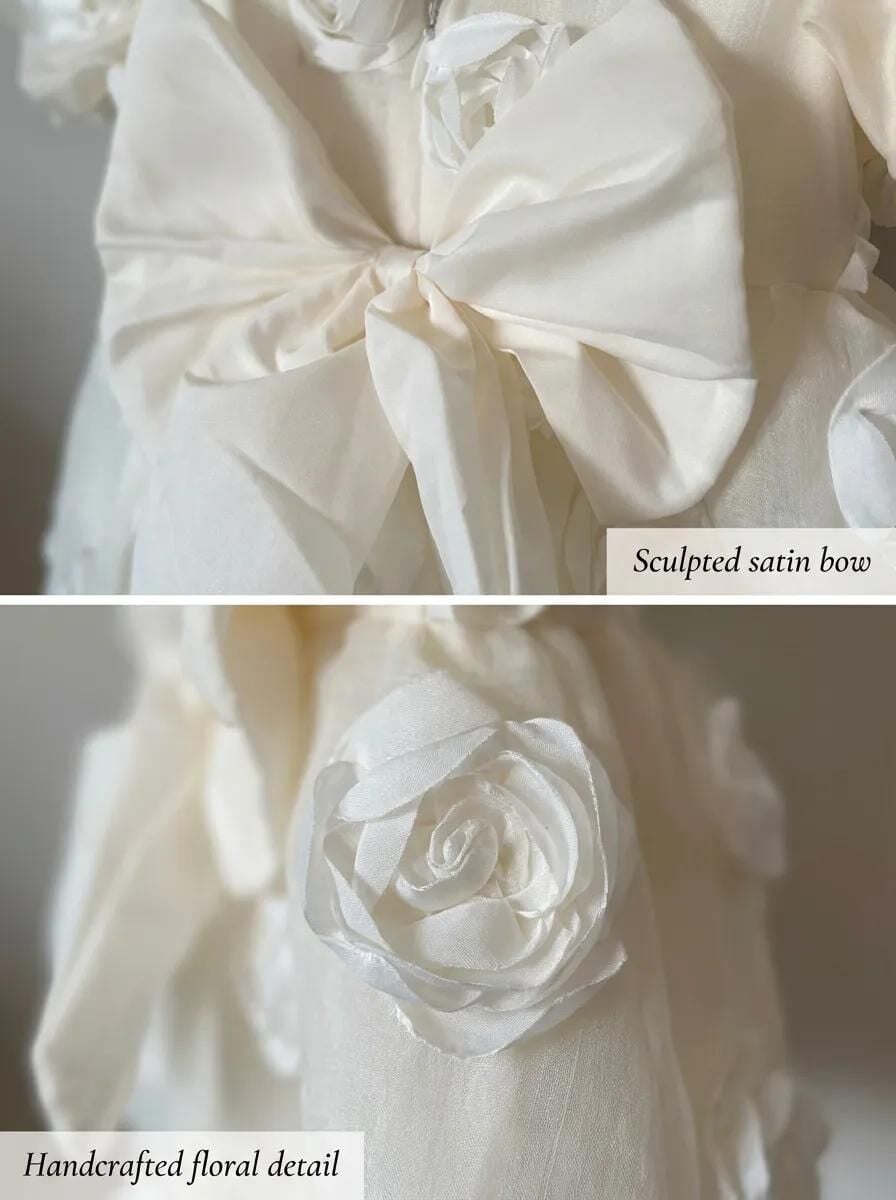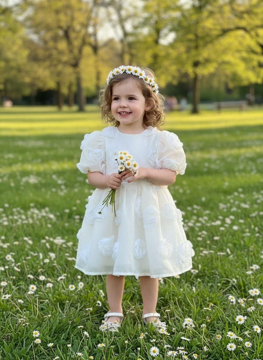 Kız Çocuk Gül Detaylı Özel Gün ve Doğum Günü Elbisesi - Ekru - 2-5 Yaş