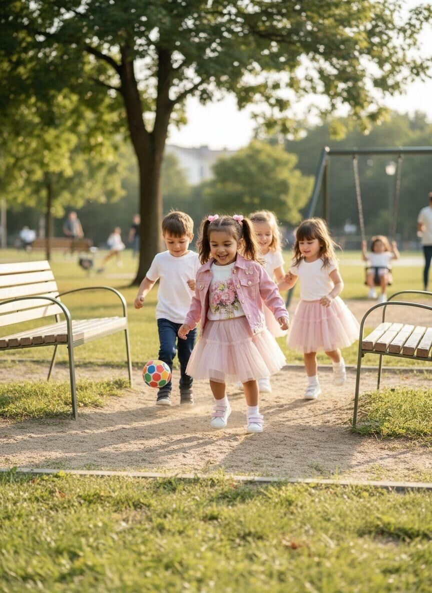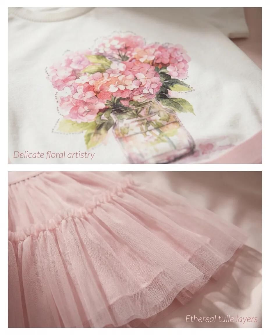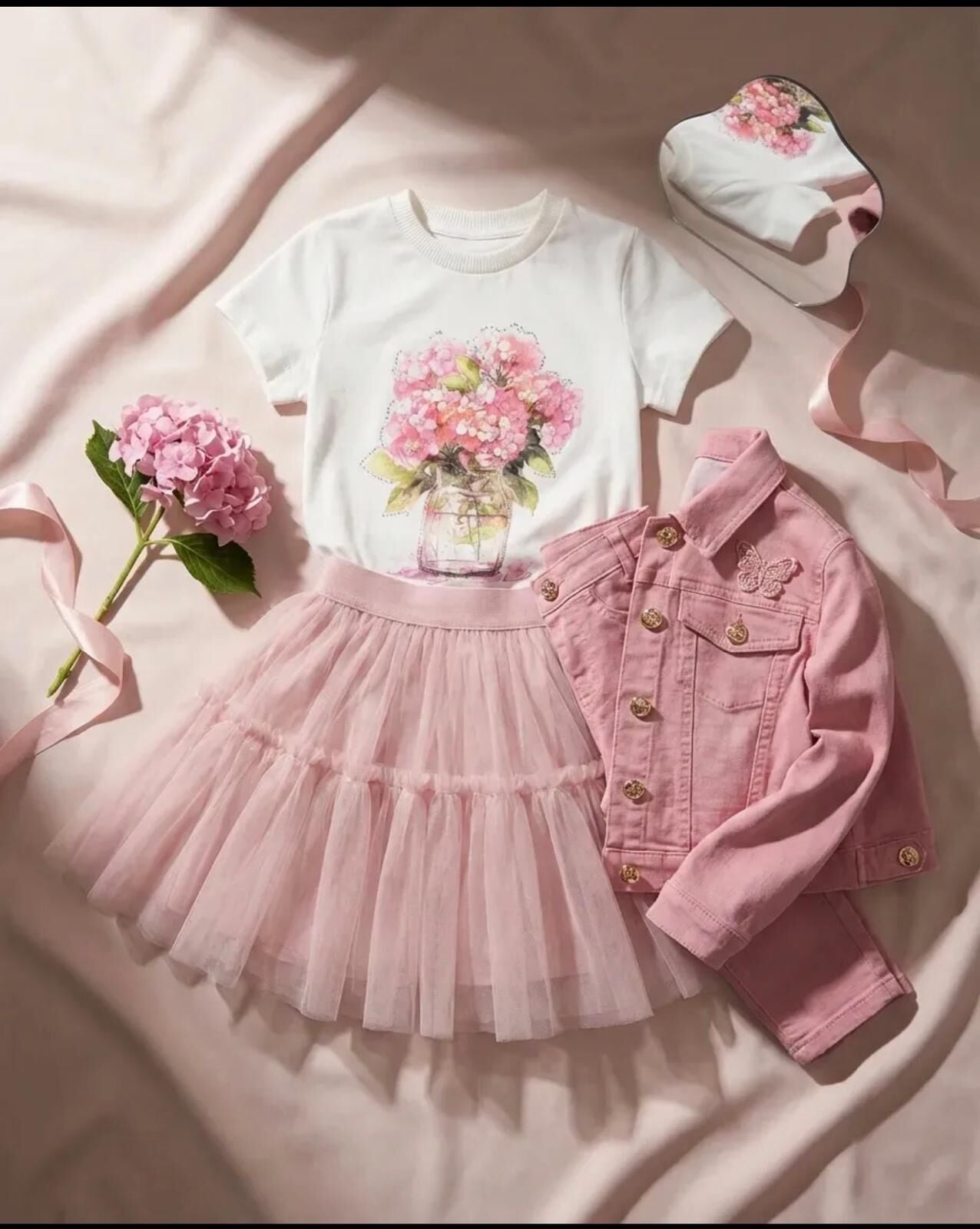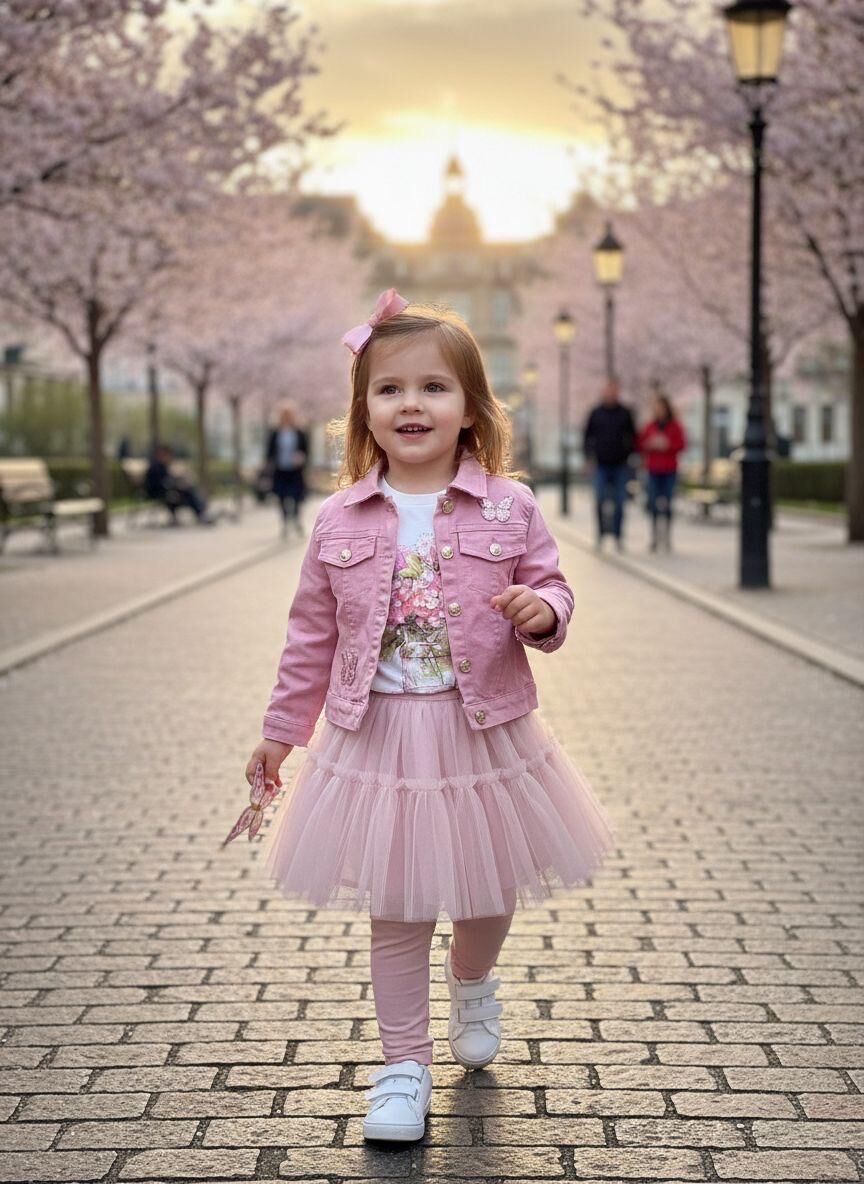 Kız Çocuk Pembe Kot Ceketli Astarlı Tül Etekli Çiçek Baskılı Parlak Taş Detaylı Tişörtlü Takım - Çok Renkli - 2-5 Yaş